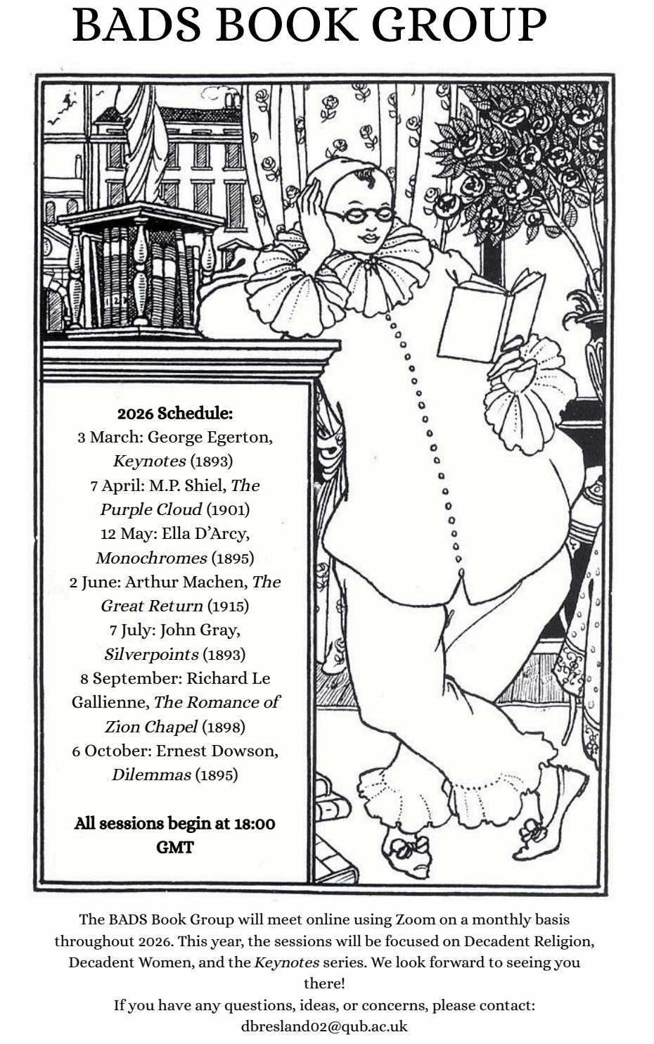 The BADS Book Group meets virtually to discuss a selected piece of decadent literature in an informal, collegial environment. Graduate students working in decadence may be particularly interested, but all are welcome!